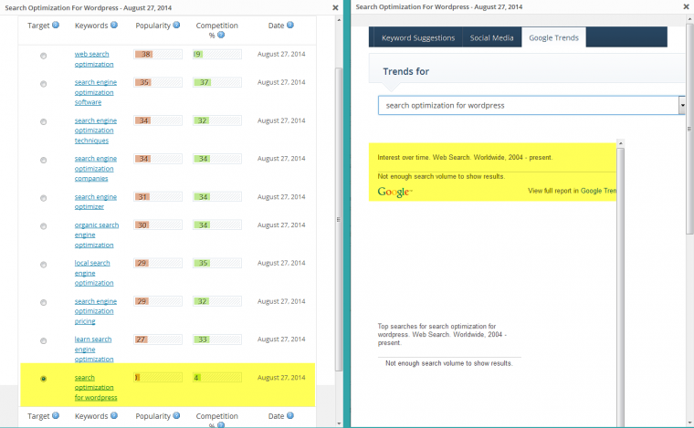 On our initial list of keywords was the phrase, “search optimization for WordPress.” It sounded reasonable and very targeted to me. Using the Scribe SEO plugin I quickly discovered that not many people search on that phrase. As seen in the images below taken directly from the Scribe SEO Plugin: